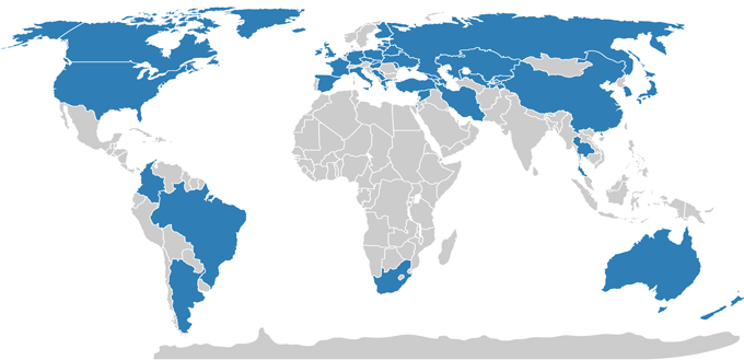 Армения, Азербайджан, Аргентина, Австралия, Босния и Герцеговина, Бразилия, Беларусь, Канада, ОАЭ, Китай, Колумбия, Кипр, Чехия, Германия, Эстония, Испания, Великобритания, Финляндия, Франция, Грузия, Венгрия, Греция, Ирландия, Израиль, Иран, Италия, Япония, Кыргызстан, Корея, Казахстан, Латвия, Люксембург, Литва, Молдавия, Нидерланды, Новая Зеландия, Перу, Польша, Сербия, Сирия, Словакия, РФ, Таиланд, Таджикистан, Турция, Украина, США, Узбекистан, ЮАР.